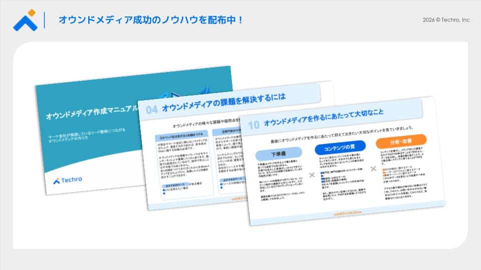 なお、テクロ株式会社では「オウンドメディア作成マニュアル」資料を無料で配布しています。