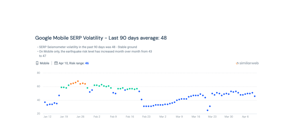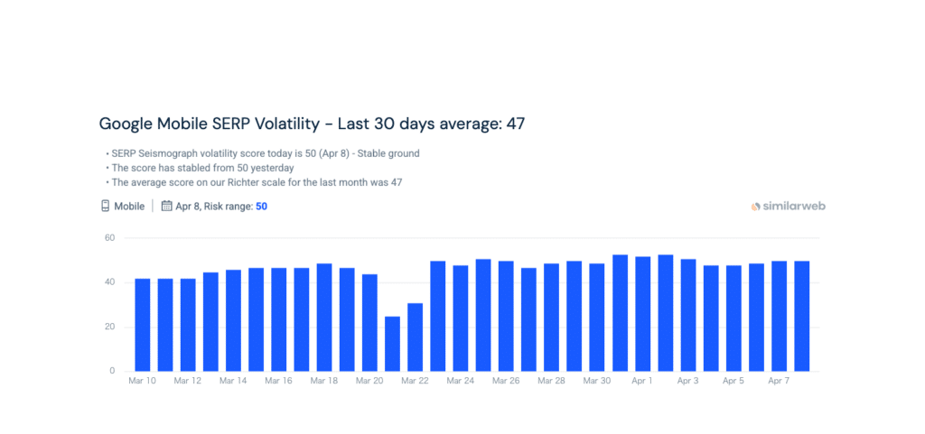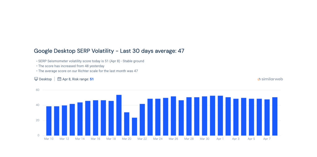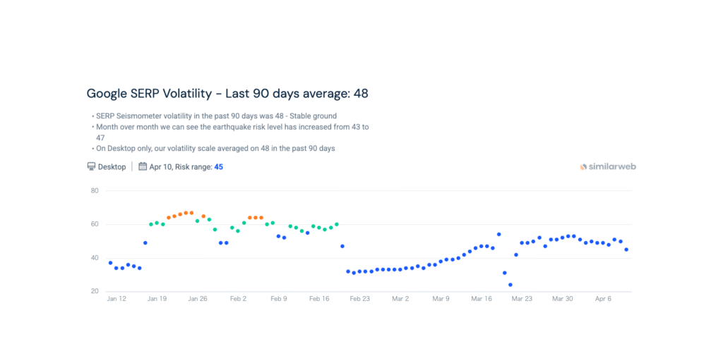 アップデートによる記事順位の変動平均値をグラフ化したSERP変動を見ると、直近30日における3月中の検索順位全体(4/10時点のデータ)は青の「low」で落ち着いていました。