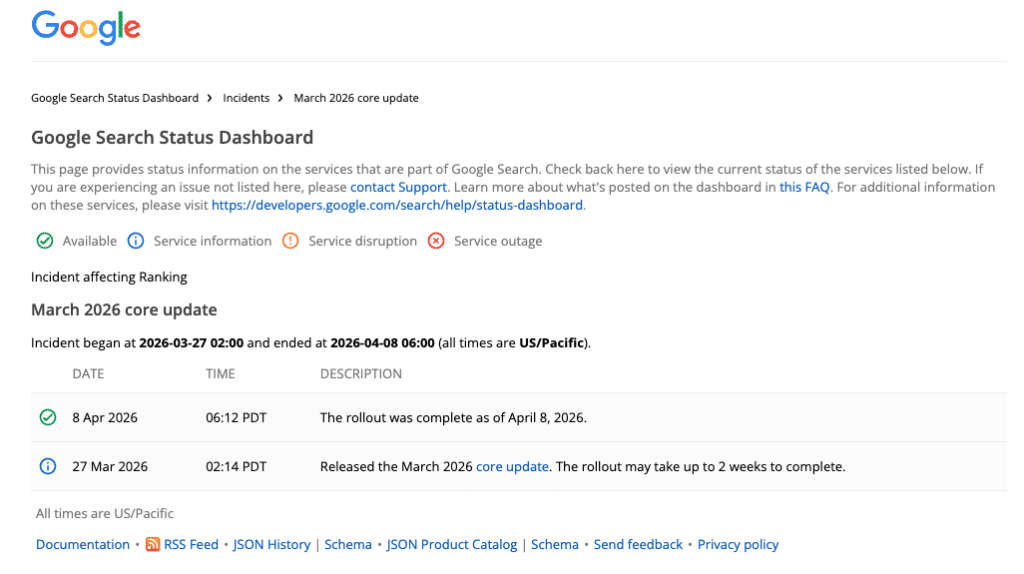 2026年3月のコアアップデートは4月8日にロールアウト完了が報告されました。コアアップデートは通常3週間ほどかかりますが、今回は12日間とやや早めの完了でした。また、2026年に入ってから最初の大規模アップデートとなります。